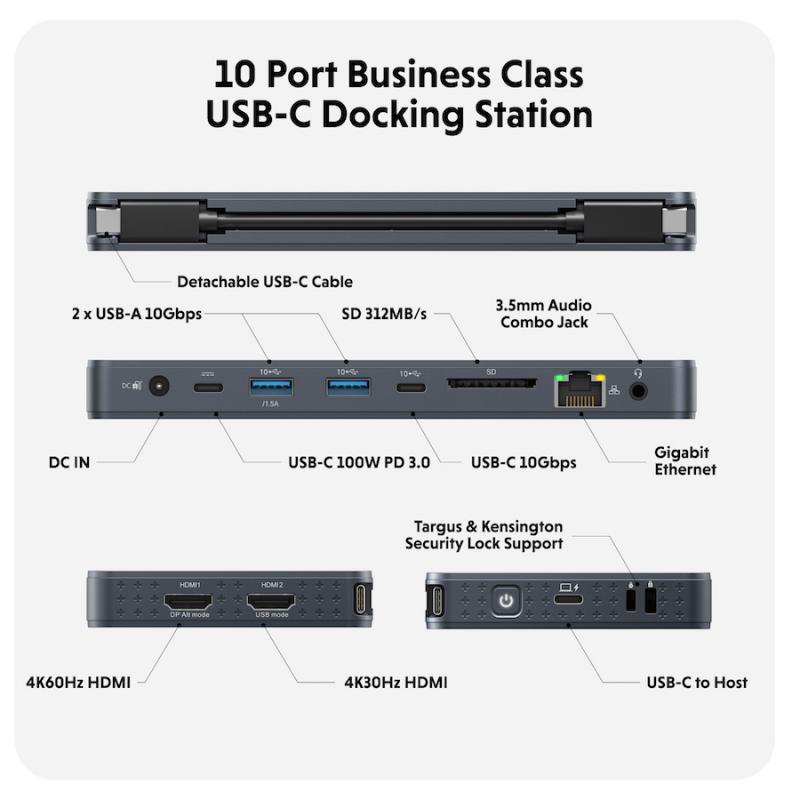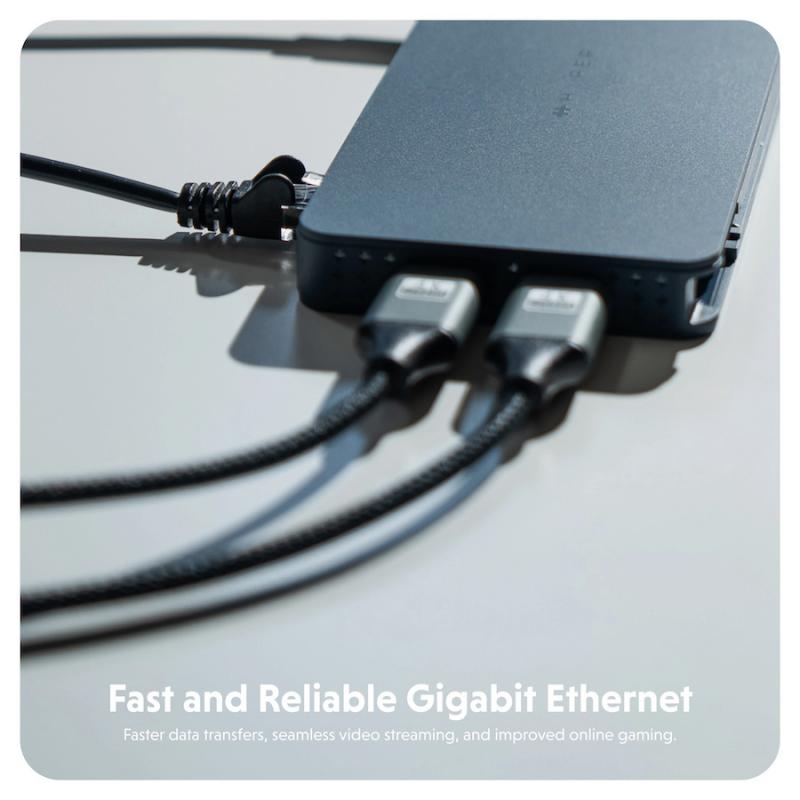 Stația de andocare Hyper® Universal Silicon Motion® USB-C 10-in-1 Dual HDMI oferă tot ce ai nevoie pentru a lucra eficient pe cele mai noi MacBook Pro sau PC-uri Windows. Un singur port lateral se extinde la 10 conectori, dintre care două porturi USB-A 10 Gbps USB 3.2 asigură alimentare prin pass-through și viteze complete de transfer de date de până la 10 Gbps. Alte caracteristici interesante includ un port USB-C 10 Gbps USB 3.2, SD 4.0 cu 312 MB/s, Gigabit Ethernet și USB-C Power Delivery 100 W PD 3.0.