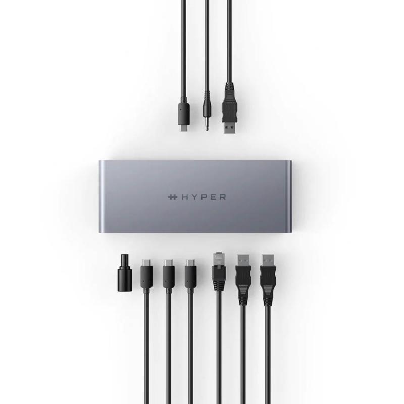 Adaptor HUB 11-in-1 Hyper Thunderbolt 4, 1x Thunderbolt 4 Upstream 40 Gb/s, 2x 2x Thunderbolt 4 Downstream 40 Gb/s, 1x HDMI 8K / 30Hz, 4x USB-A, 1x SD, 1x Jack 3.5mm, Gri