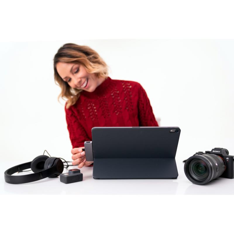 Transferul de date funcționează imediat după conectarea cablurilor, astfel încât poți descărca date direct de pe cardul SD sau poți folosi tastele funcționale ale unei tastaturi conectate. În plus, pe un ecran extern poți reda videoclipuri sau filme la rezoluție 4K și poți transmite sunetul către căști.