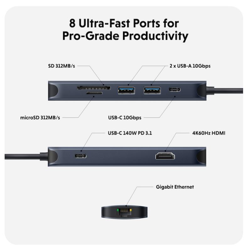 | Porturi | 1x USB-C 10 Gbps, 1x USB-C PD 140W, 1x HDMI 4K / 60Hz, 2x USB-A, 1x SD, 1x MicroSD, 1x Gigabit Ethernet |