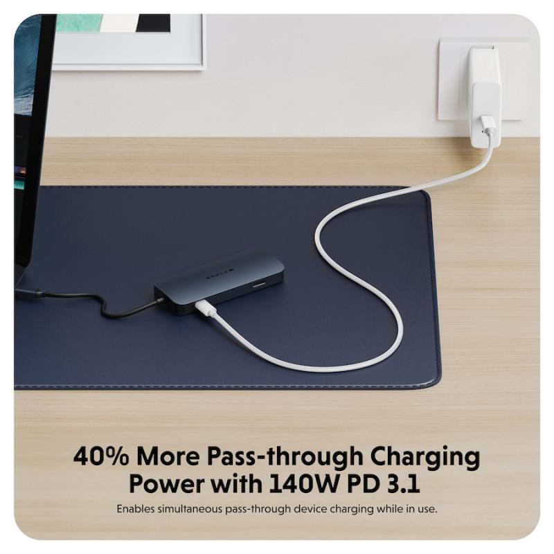 Poți alimenta și încărca dispozitivele cu până la 140 W folosind PD 3.1*, chiar în timp ce folosești hub-ul, asigurând productivitate neîntreruptă – ideal pentru dispozitive cu consum mare de energie și profesioniști ocupați.