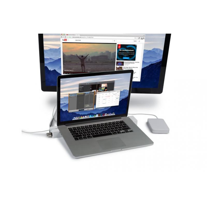 Nu va mai trebui să conectezi cablurile de fiecare dată când ajungi acasă sau la birou. Toate cablurile rămân conectate chiar și atunci când îți iei MacBook-ul cu tine.