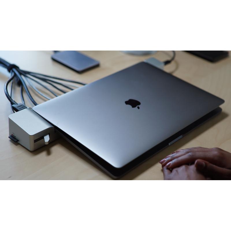 Nu va mai trebui să conectezi cablurile de fiecare dată când te întorci acasă sau la birou. Toate cablurile rămân conectate chiar și atunci când iei MacBook-ul cu tine.