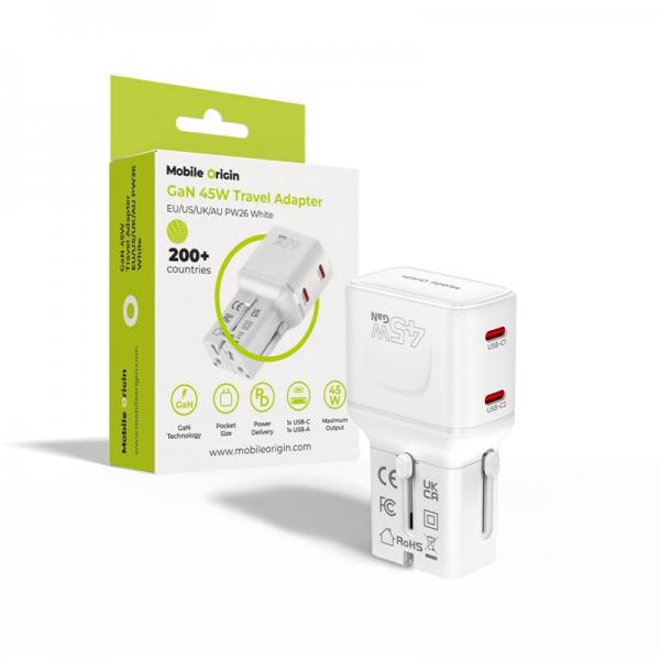 Adaptor retea Mobile Origin GaN, 45W, 2x USB-C, Compatibil cu prize EU/UK/US/AU, Alb Cod produs: MOB-174109
