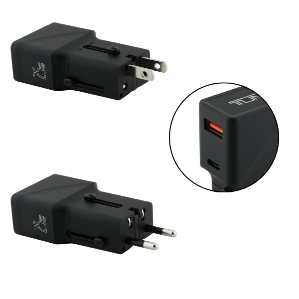 Adaptor de călătorie 25W oferă putere excepțională și versatilitate, susținând diverse standarde de putere. Adaptorul este echipat cu un port USB-C care suportă tehnologiile Quick Charge, Power Delivery (PD) și PPS, precum și un port USB-A, permițând încărcarea dispozitivelor mobile, laptopurilor și altor accesorii. Funcționează în peste 200 de țări din întreaga lume cu prize US / AU / EU / UK. Datorită acestui dispozitiv, ai nevoie de un singur adaptor pentru călătoriile tale globale.