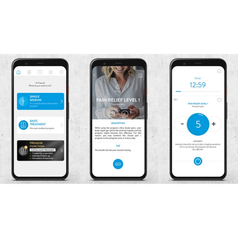 Prin Bluetooth, aplicația oferă peste 100 de programe pentru 15 zone ale corpului. Poți selecta sesiuni unice sau programe complete, iar aplicația te ghidează în alegerea setărilor și poziționarea electrozilor.