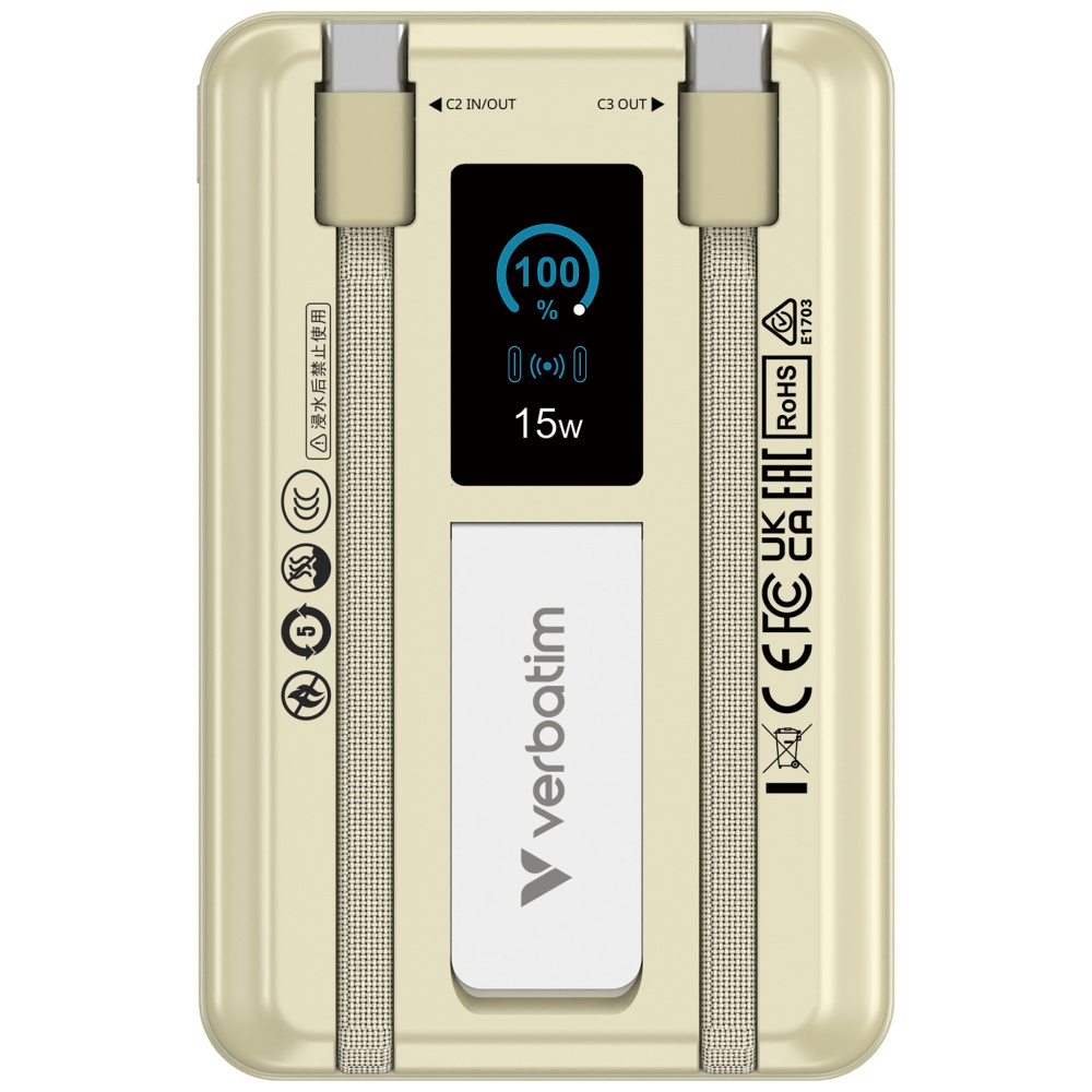 Powerbank-ul Verbatim Charge 'n' Go este o sursă de energie practică cu o capacitate de 10000 mAh, proiectat pentru alimentarea zilnică a smartphone-urilor și dispozitivelor mobile. Modelul utilizează un afișaj TFT care arată nivelul de energie și starea de funcționare curentă. Dispozitivul combină încărcarea prin cablu și wireless, sporind confortul și flexibilitatea. Datorită dimensiunilor sale compacte, se potrivește ușor într-o geantă sau rucsac, iar capacitatea de a încărca mai multe dispozitive simultan îmbunătățește funcționalitatea sa. Charge 'n' Go este potrivit pentru călătorii, muncă și activități zilnice.