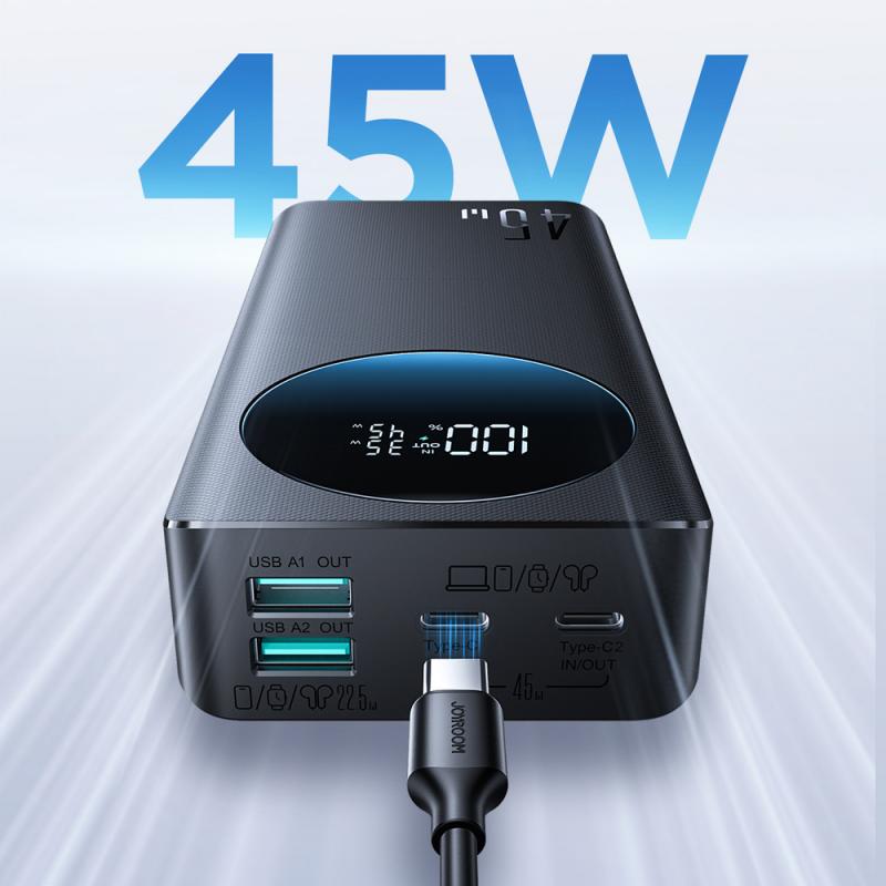 Joyroom JR-PBF02 Pro este o baterie externă puternică, cu o capacitate mare de 20.000 mAh, concepută pentru încărcarea rapidă a mai multor dispozitive. Cu o putere de până la 45W, poate alimenta eficient smartphone-uri, tablete și alte dispozitive mobile. Cele două porturi USB-C și două porturi USB-A permit încărcarea simultană a până la patru dispozitive. Bateria externă suportă și încărcare rapidă proprie de până la 30W, reducând timpul necesar pentru reîncărcare. Designul compact o face ușor de transportat, în ciuda capacității mari. Este o soluție practică pentru autonomie extinsă în utilizarea zilnică.
