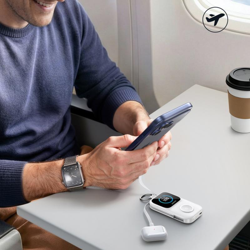 Joyroom JR-W19 este o baterie externă compactă, concepută pentru încărcarea comodă a ceasurilor inteligente și a dispozitivelor mobile. Suprafața magnetică integrată permite încărcare wireless de până la 5W. Cablurile integrate USB-C și Lightning cresc funcționalitatea și elimină necesitatea cablurilor suplimentare. Afișajul digital clar permite monitorizarea în timp real a nivelului de energie. Designul compact cu mâner o face ușor de transportat, fiind o soluție practică pentru organizarea încărcării și creșterea portabilității.