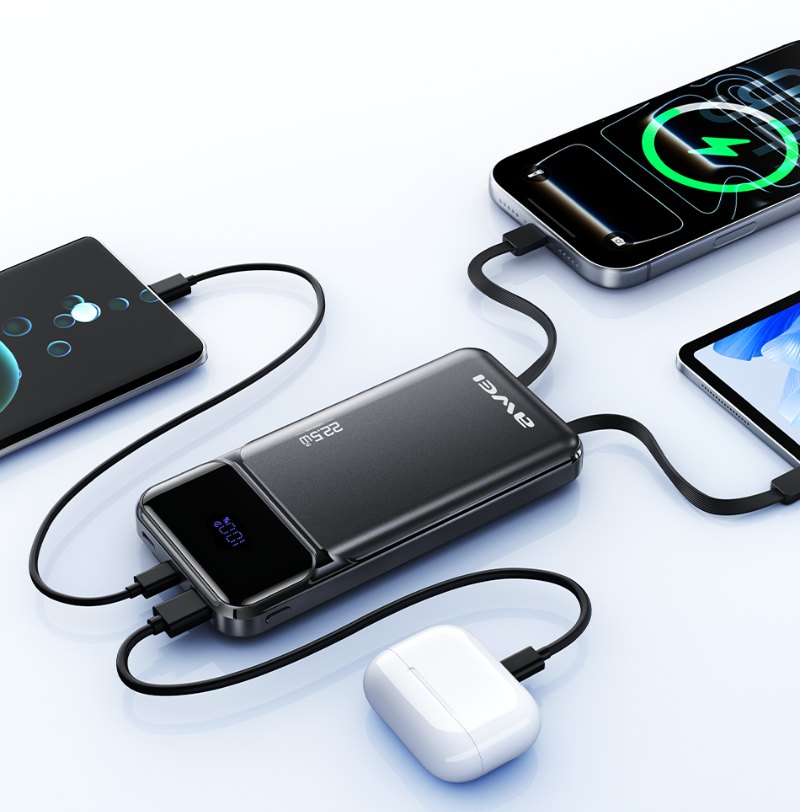 AWEI PA-91 permite încărcarea a până la patru dispozitive simultan prin porturile USB-A, USB-C și cablurile încorporate. Bateria performantă de 10.000 mAh asigură o încărcare rapidă și eficientă a smartphone-urilor, tabletelor și altor accesorii.