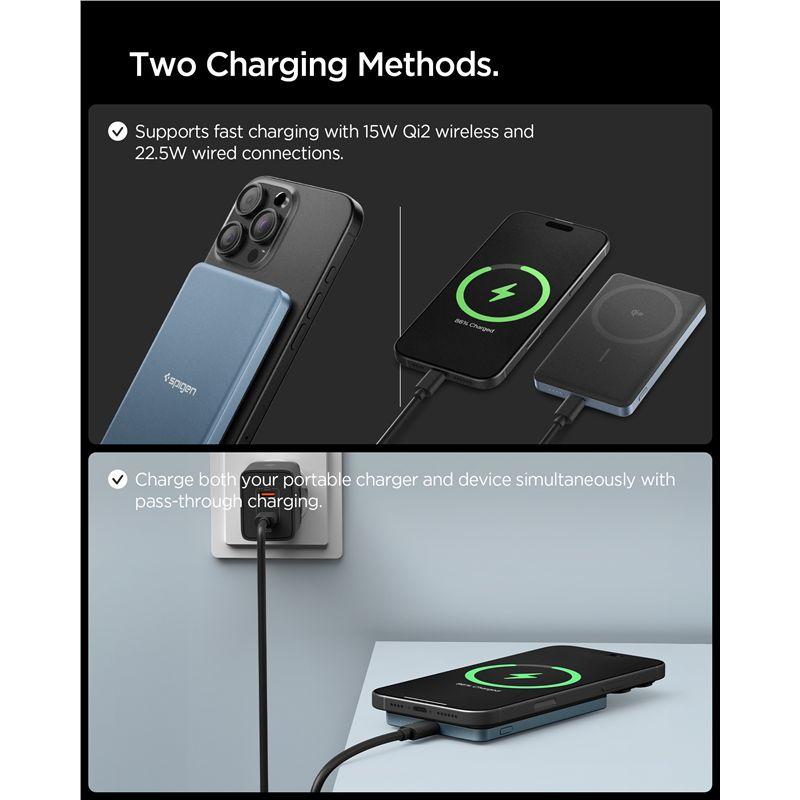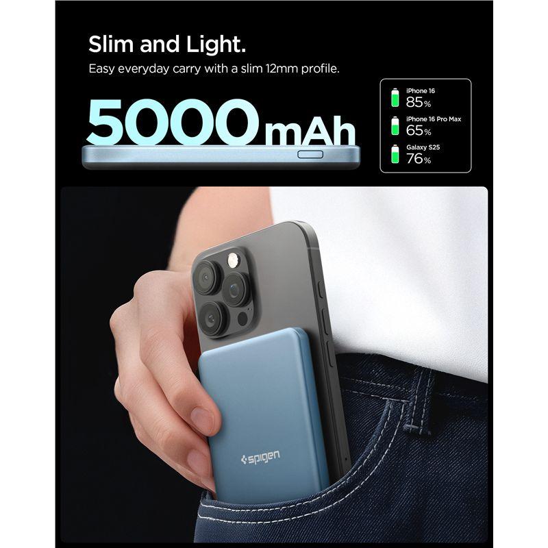 Baterie externa portabila Spigen Essential, 5000mAh, Compatibila MagSafe, Incarcare Wireless 15W, PD 22.5W, USB-C, Albastru