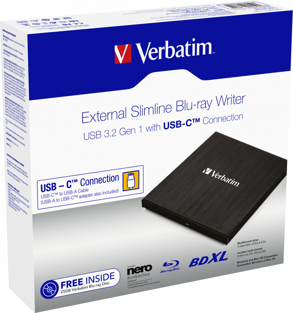 Recorder extern Blu-ray Slimline cu conexiune USB-C™. Cablu USB-C™/USB-A (cu adaptor USB-A/USB-C™ inclus). USB 3.2 GEN 1. Compact și ușor, ideal pentru notebook-uri și ultrabook-uri. Alimentat prin port USB - fără adaptor de alimentare voluminos. Software Nero Burn & Archive inclus. Capacitate de până la 100 GB pe disc BDXL / 8.5 GB pe DVD cu două straturi / 4.7 GB pe DVD standard. Complet compatibil cu tehnologia de arhivare M-DISC. Include un disc Blu-ray Verbatim GRATUIT cu capacitate de 25 GB.