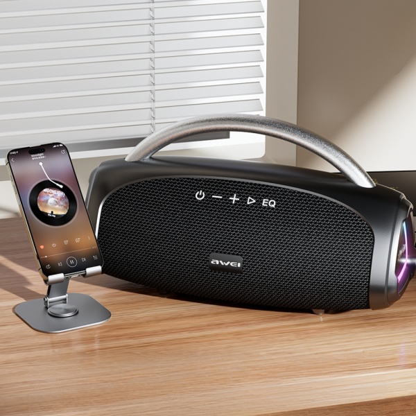 Boxa wireless AWEI KA39 este o combinație de design elegant și funcționalitate ridicată. Designul său compact cu o mână convenabilă permite transportul ușor oriunde – de la living la întâlniri în aer liber cu prietenii. Carcasa neagră cu iluminare RGB integrată adaugă o notă modernă și creează o atmosferă unică în timp ce redă muzica. Dispozitivul este conceput având în vedere confortul utilizatorului, oferind butonuri de control intuitive și un indicator de putere clar care arată starea de funcționare. Este o soluție ideală pentru cei care apreciază mobilitatea și stilul.