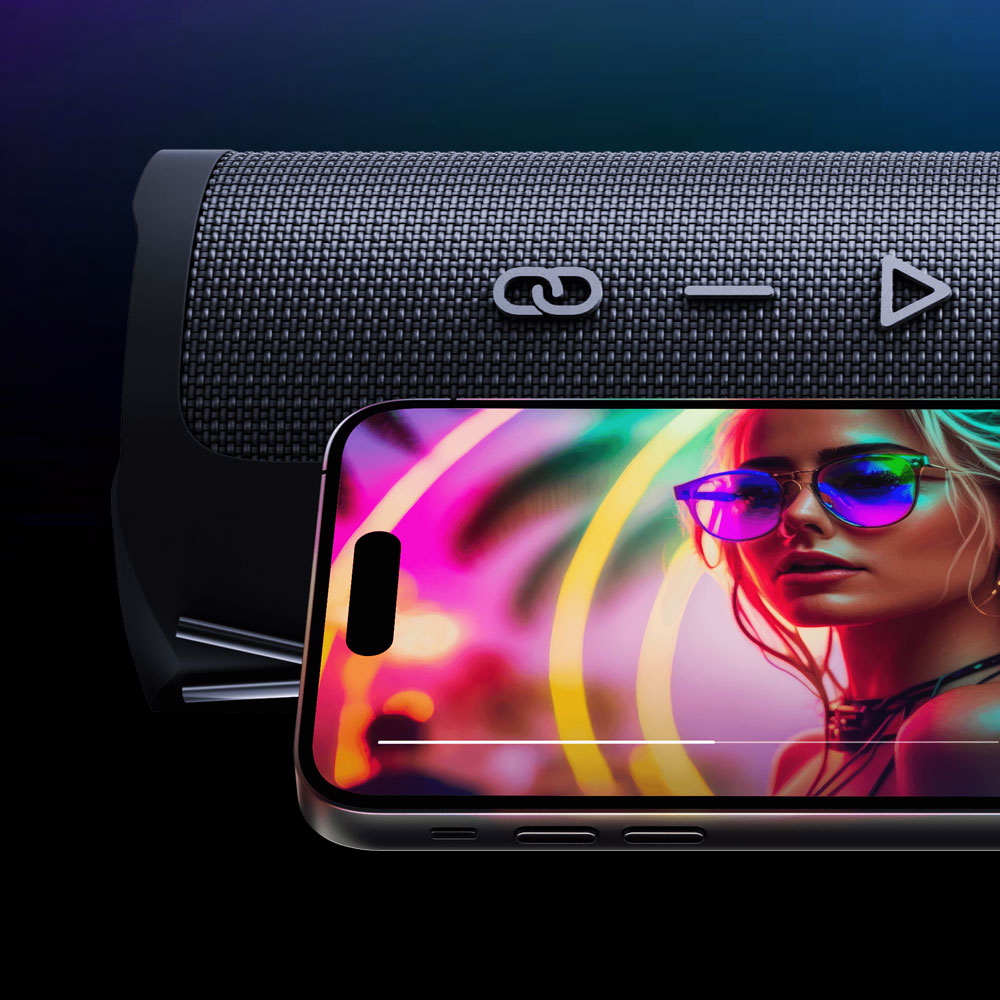 Boxa Fuego este echipată cu un power bank integrat. Pur și simplu conectează-ți telefonul pentru a începe încărcarea dispozitivului-chiar și în timp ce asculți muzică!