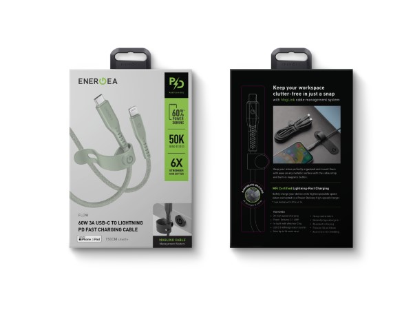 Cablul Flow a fost special conceput pentru a alimenta dispozitivele Apple. Echipat cu un conector lightning la un capăt și un conector USB-C la celălalt capăt, permite încărcarea și sincronizarea datelor rapidă și fără probleme. Conectorul lightning este compatibil cu dispozitivele Apple precum iPhone, iPad și iPod.