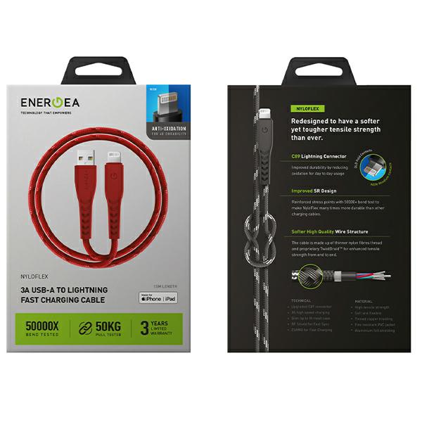 Cablu pentru incarcare si transfer de date ENERGEA Nyloflex C89, USB-A la Lightning, 3A, 480Mbps, 1.5m, Rosu Cod produs: ENE-165992