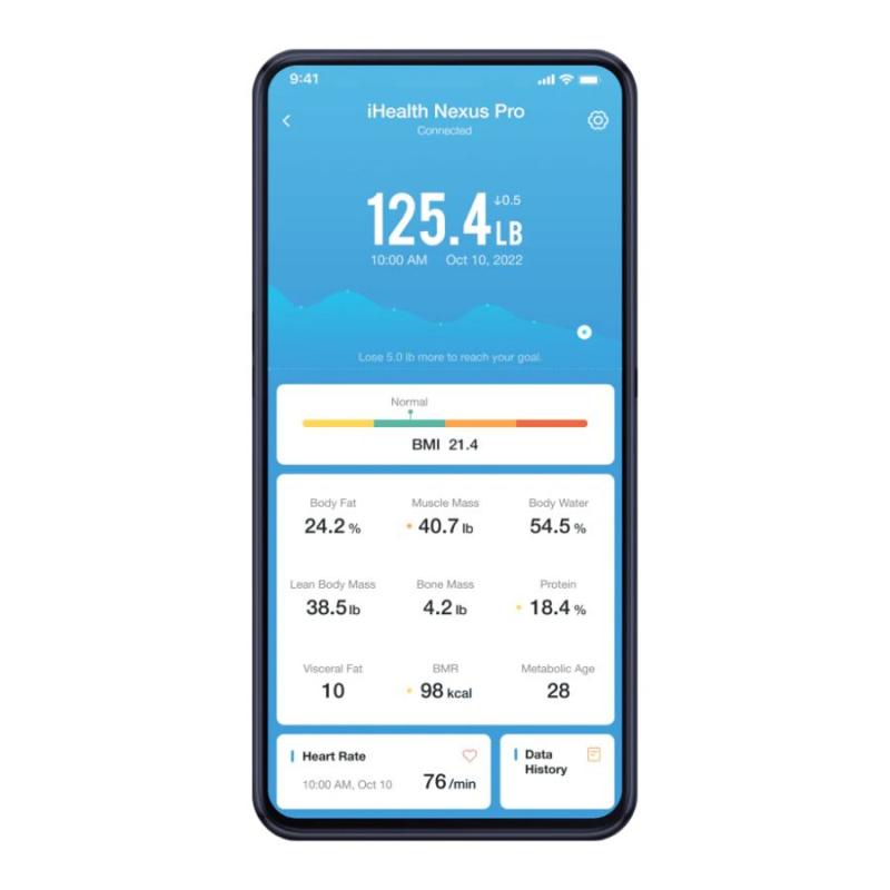 Prin sincronizarea cu aplicația iHealth MyVitals, ai acces la toți parametrii suplimentari și la istoricul complet al datelor. Datele pot fi sincronizate și cu Apple Health, Google Fit, Epic EMR și Fitbit.