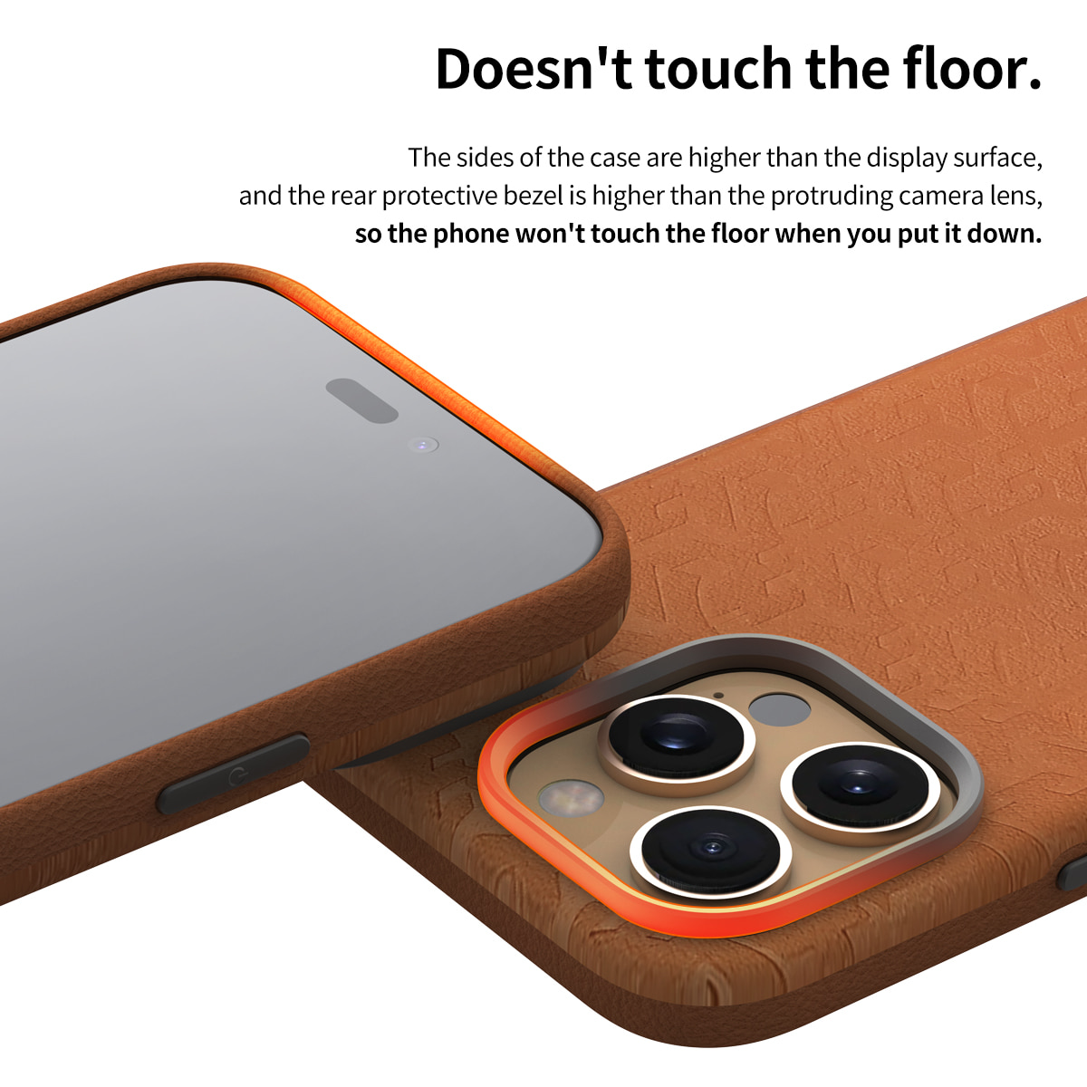 Lateralele carcasei sunt mai înalte decât suprafața display-ului, iar cadrul protector din spate este mai înalt decât obiectivul camerei care iese în evidență, astfel încât telefonul să nu atingă podeaua atunci când îl așezi.