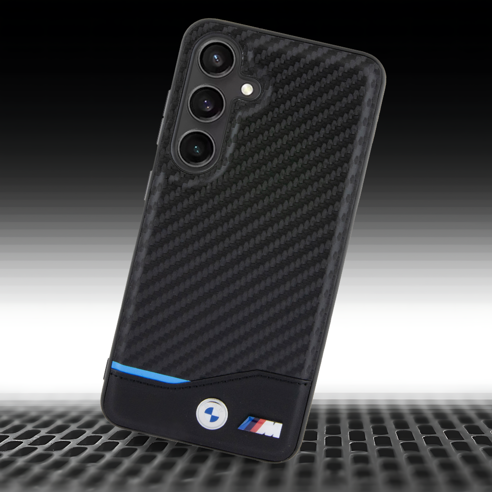 Partea superioară a husei este acoperită cu țesătură din carbon și eco-piele moale, oferind smartphone-ului tău un aspect unic și extraordinar. Husa dispune de cusături albastre, armonizându-se cu culorile de marcă BMW. Pielea moale, modelul unic din carbon și detaliile elegante conferă colecției o formă clasică și elegantă. Designul este finalizat cu un mic logo metalic BMW și M package, confirmând calitatea superioară și autenticitatea.