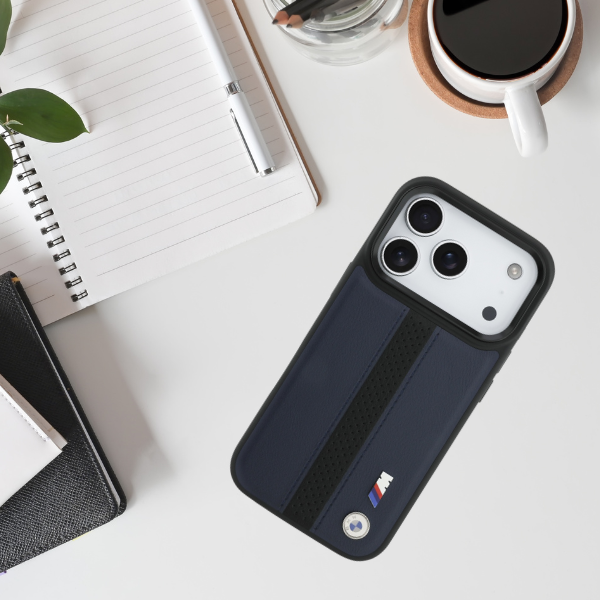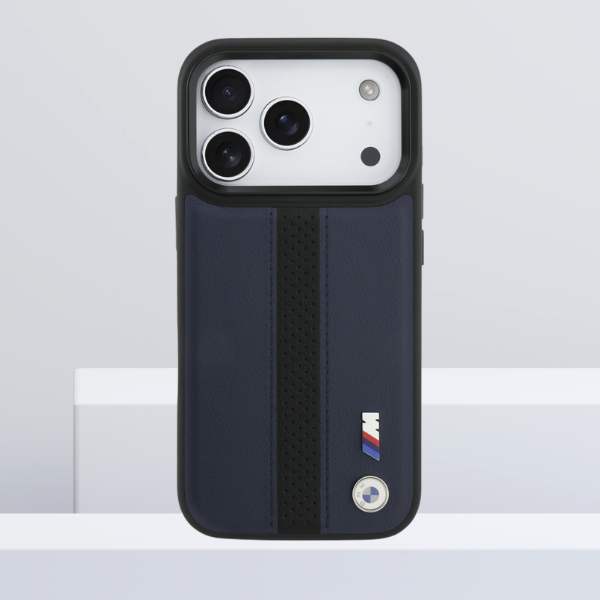 Carcasa BMW M Perforated Stripe Logo cu MagSafe compatibila cu iPhone 17 Pro, Navy Blue