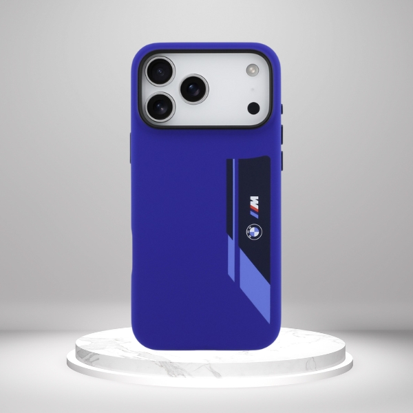 Caracteristica sa distinctivă este dunga geometrică verticală în nuanțe de albastru marin, referindu-se la estetica sportivă a BMW M. Suprafața carcasei este decorată cu logo-ul BMW și emblema M, evidențiind caracterul său dinamic și elegant. Carcasa include un cadru negru pentru cameră și coperți integrate pentru butoane, asigurând o protecție suplimentară și un aspect uniform.