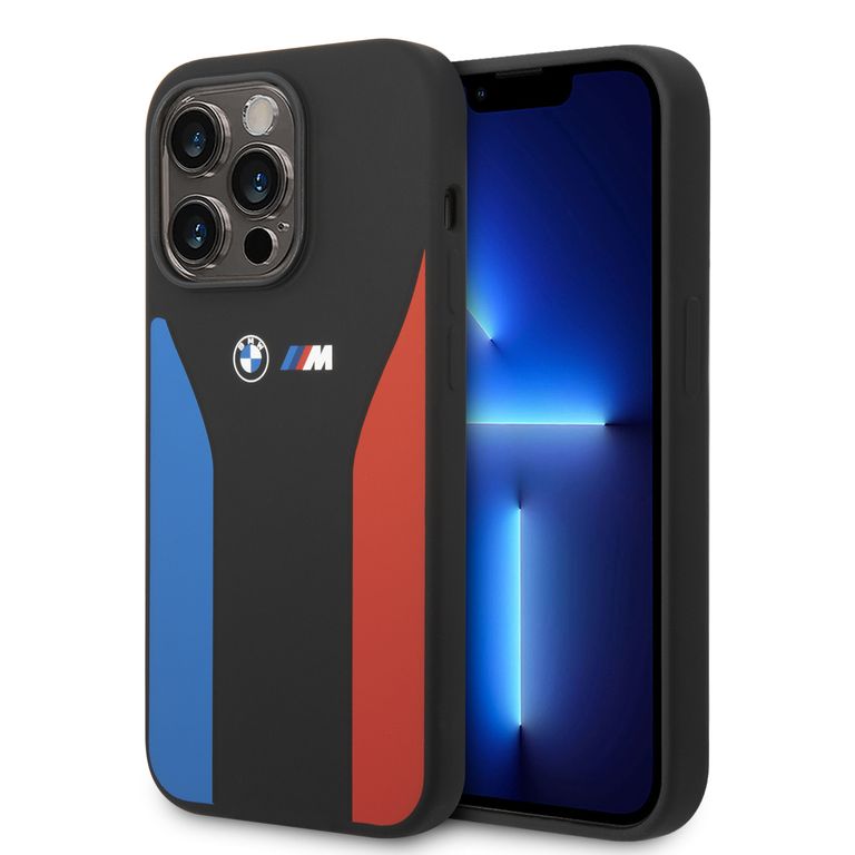 Carcasa BMW Silicone Blue and Red Stripes M Collection compatibila cu iPhone 14 Pro, Negru