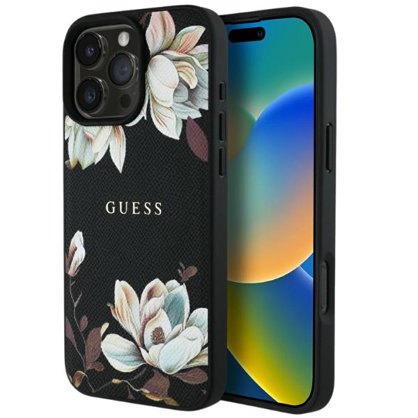 Carcasa Guess Grained Printed Flower Pattern cu MagSafe compatibila cu iPhone 16 Pro, Negru Cod produs: GUE-172140