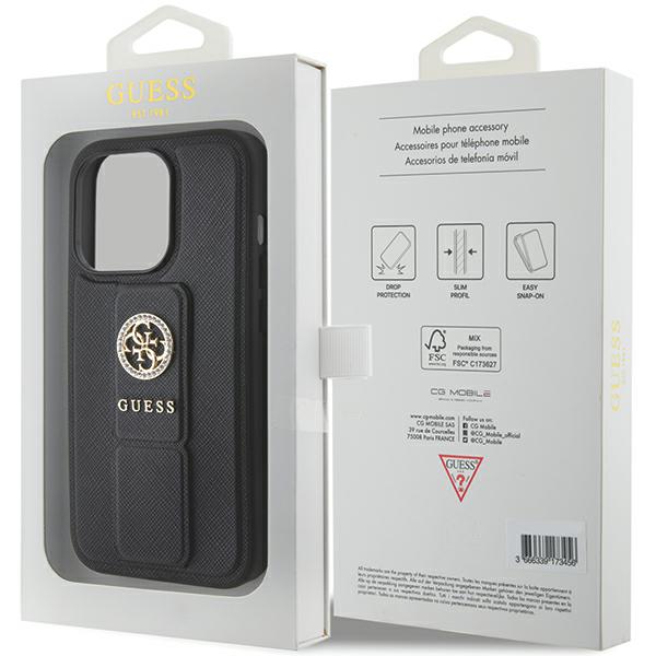 Carcasa Guess Grip Stand 4G Saffiano Strass compatibila cu iPhone 15 Pro, Negru