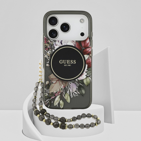Carcasa Guess IML Flowers Pearl Strap cu MagSafe compatibila cu iPhone 17 Pro, Negru Cod produs: GUE-166780