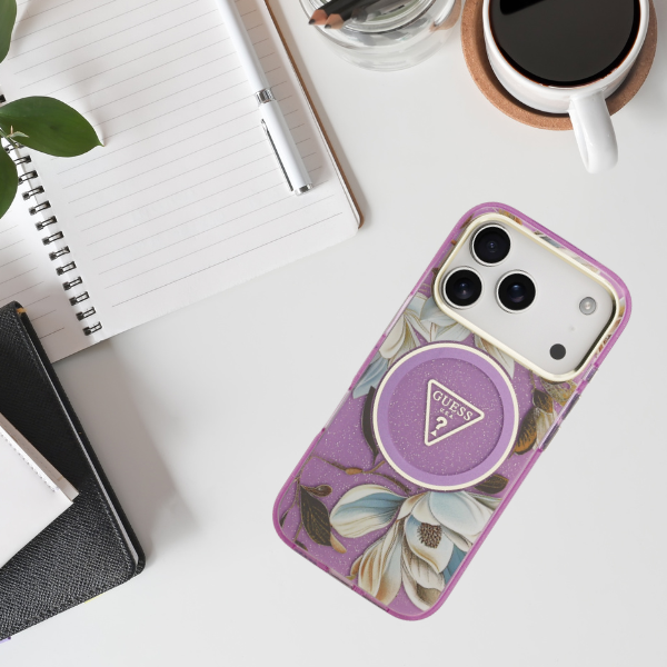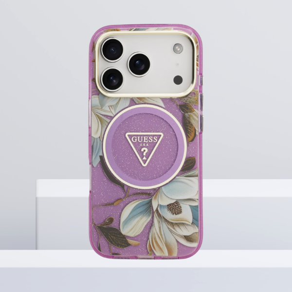 Carcasa Guess IML Glitter Flowers Triangle cu MagSafe compatibila cu iPhone 17 Pro, Mov Cod produs: GUE-166861