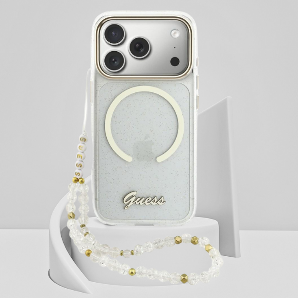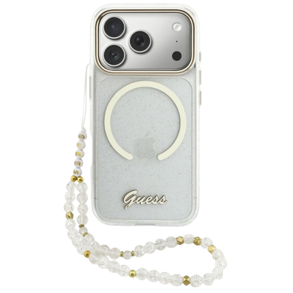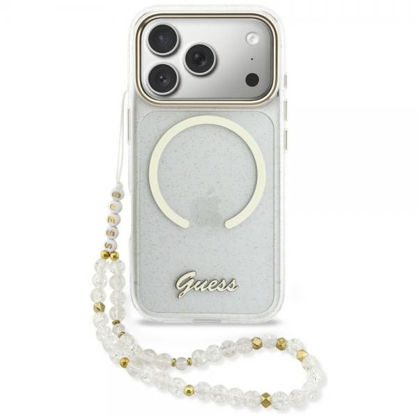Carcasa Guess IML Glitters Script Strap cu MagSafe compatibila cu iPhone 17 Pro, Transparent Cod produs: GUE-177575
