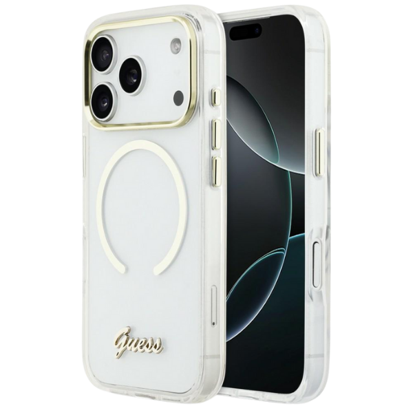 Carcasa Guess IML Script Metal cu MagSafe compatibila cu iPhone 17 Pro, Transparent Cod produs: GUE-177566
