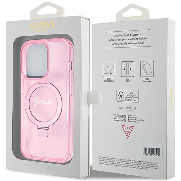 Carcasa Guess Ring Stand Script Glitter cu MagSafe compatibila cu iPhone 15 Pro, Roz