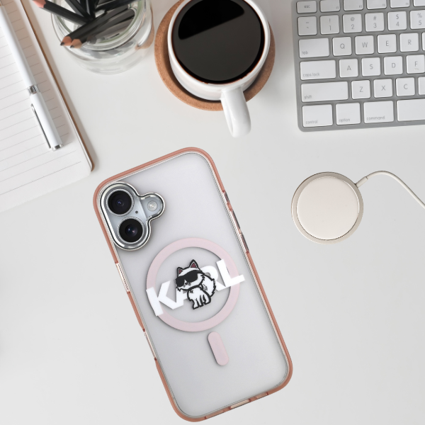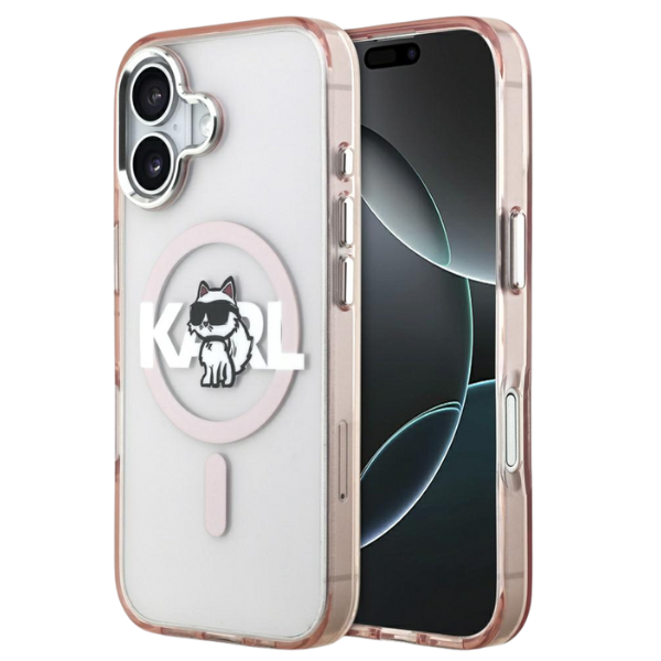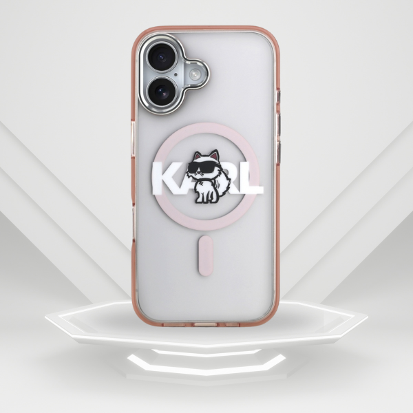 Partea din spate prezintă un motif imprimat cu Choupette, pisica purtând ochelari cu o inscripție mare KARL, completat de un inel MagSafe vizibil.