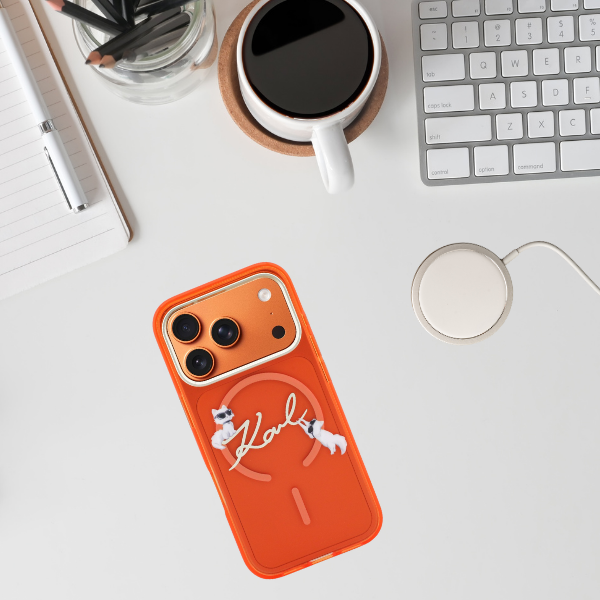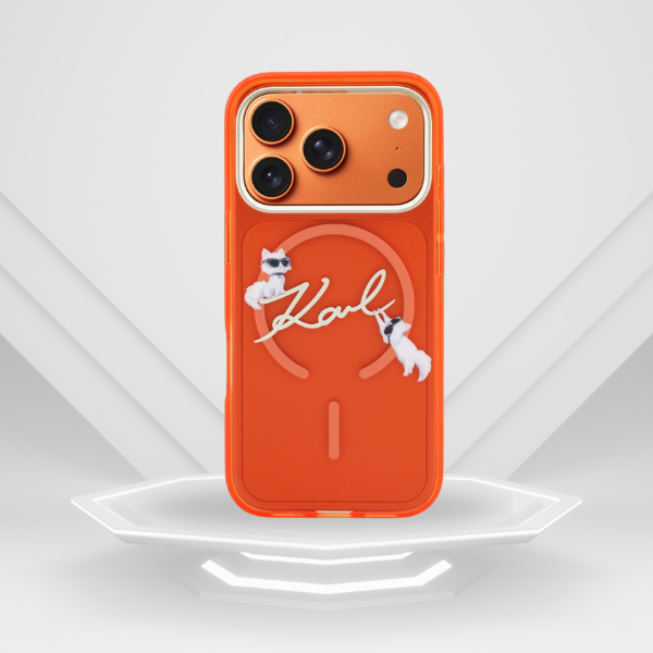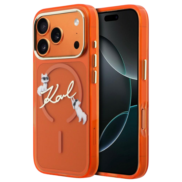 Carcasa Karl Lagerfeld IML Choupettes Karl Script Logo cu MagSafe compatibila cu iPhone 17 Pro Max, Portocaliu Cod produs: KAR-177580