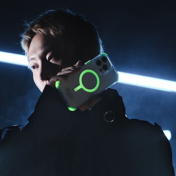 O carcasă transparentă care se evidențiază prin funcția sa de strălucire în întuneric datorită inelului fotoluminiscent mag-charge și a protecțiilor de colț. Oferă o protecție completă, menținând telefonul în siguranță în timp ce atrage atenția cu efectul său de iluminare unic. Este soluția perfectă pentru cei care doresc să se evidențieze și să se bucure de funcționalitate în același timp.