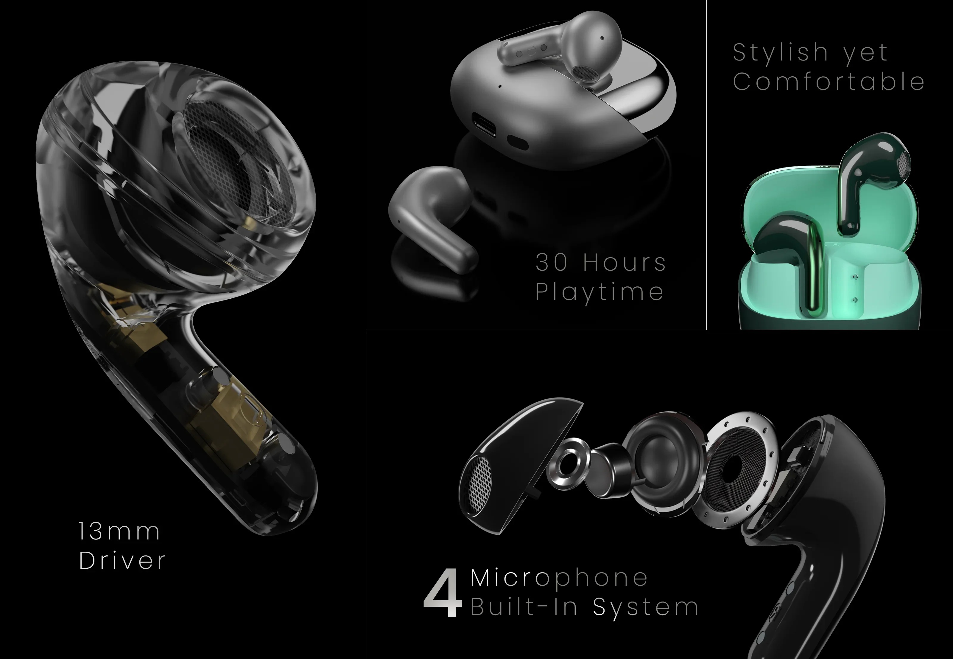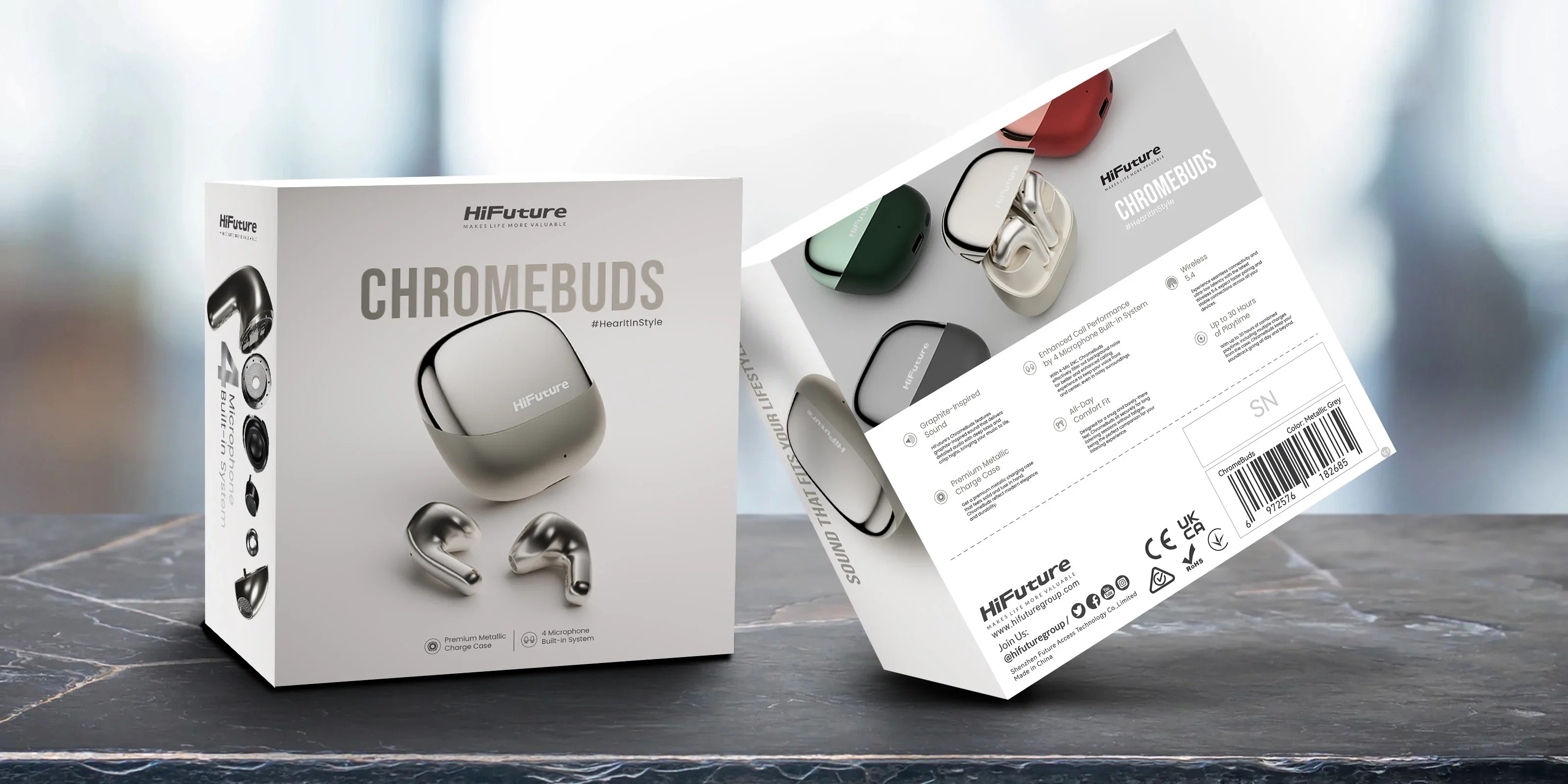 ChromeBuds sunt disponibile în patru finisaje metalice îndrăznețe: Graphite Black, Titanium Silver, Emerald Green și Crimson Red. Fiecare culoare este lucioasă, distinctivă și creată să iasă în evidență — exact ca tine.
