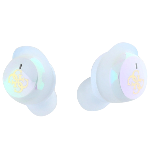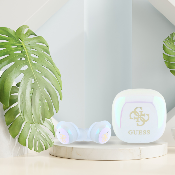 Căștile sunt fabricate din policarbonat alb, oferindu-le un aspect elegant, minimalist. Logo-ul auriu Guess de pe carcasă adaugă un accent de lux.