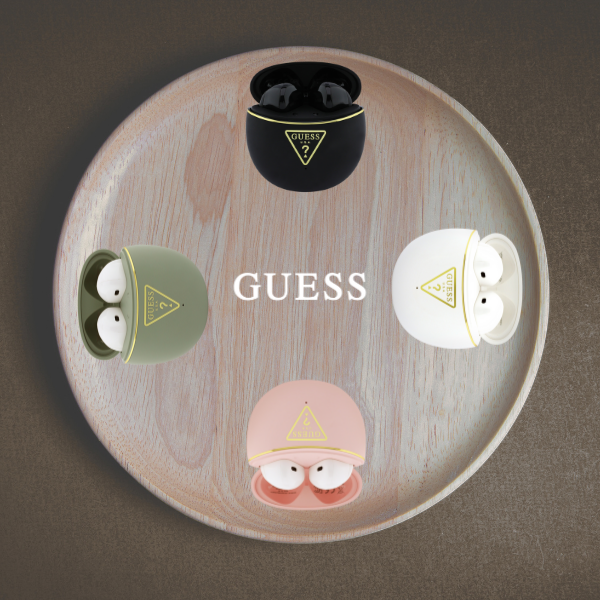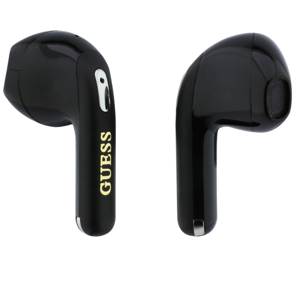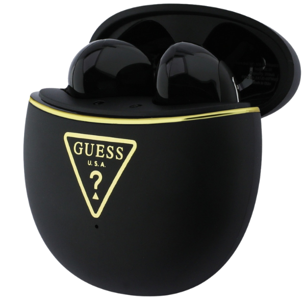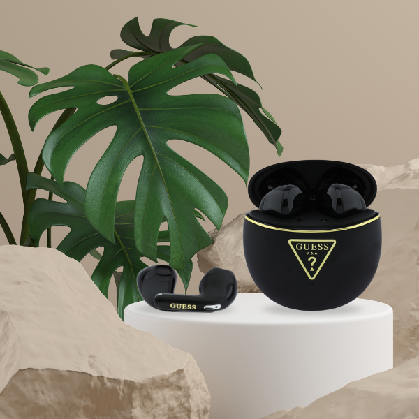 Culoarea neagră conferă căștilor un aspect distinctiv și minimalist. Logo-ul de aur Guess de pe carcasă adaugă un accent luxos.