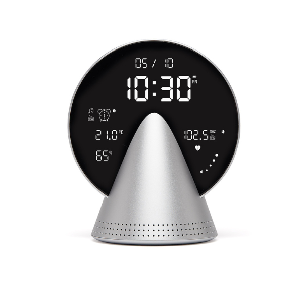 Ceasul Conic de la Lexon este un ceas deșteptător de designer cu radio FM și un difuzor Bluetooth® integrat, proiectat de Lidia Gómez. Acesta combină tehnologia modernă cu o formă elegantă – baza conică din aluminiu și display-ul rotund LCD fac din acest dispozitiv o completare stilată pentru dormitor, birou sau living. Ecranul mare afișează ora, temperatura și umiditatea, oferind acces rapid la cele mai importante informații.