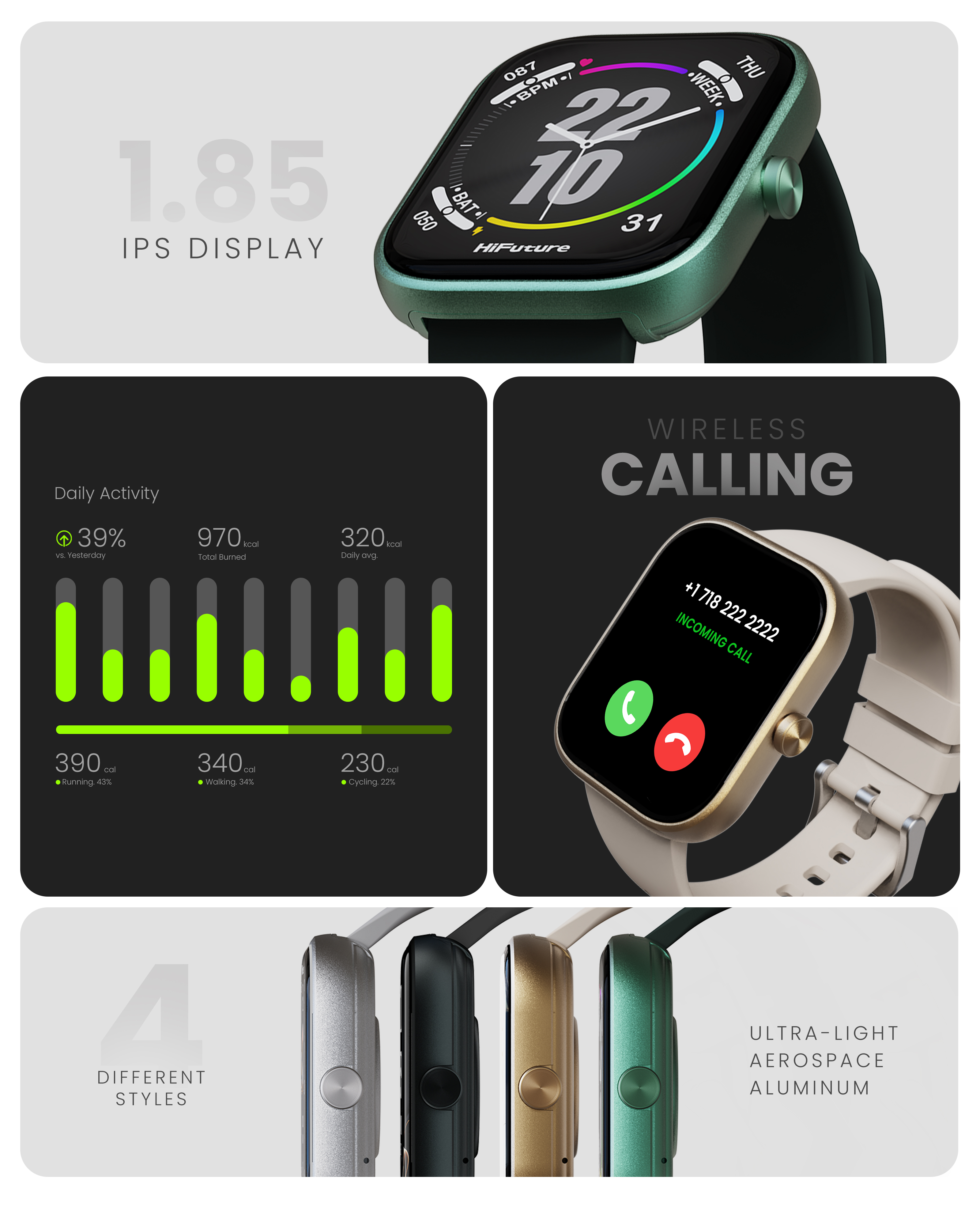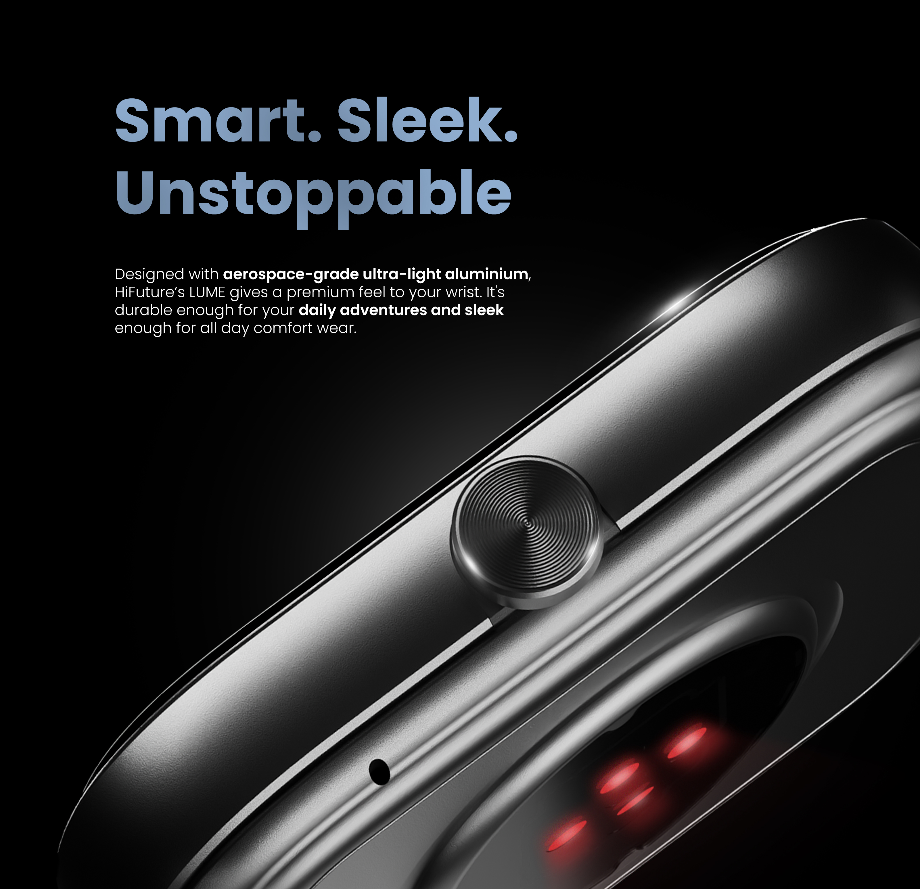 Proiectat din aluminiu ultraușor de calitate aerospațială, HiFuture LUME oferă un aspect premium la încheietura mâinii. Este suficient de durabil pentru aventurile zilnice și suficient de elegant pentru a fi purtat confortabil toată ziua.