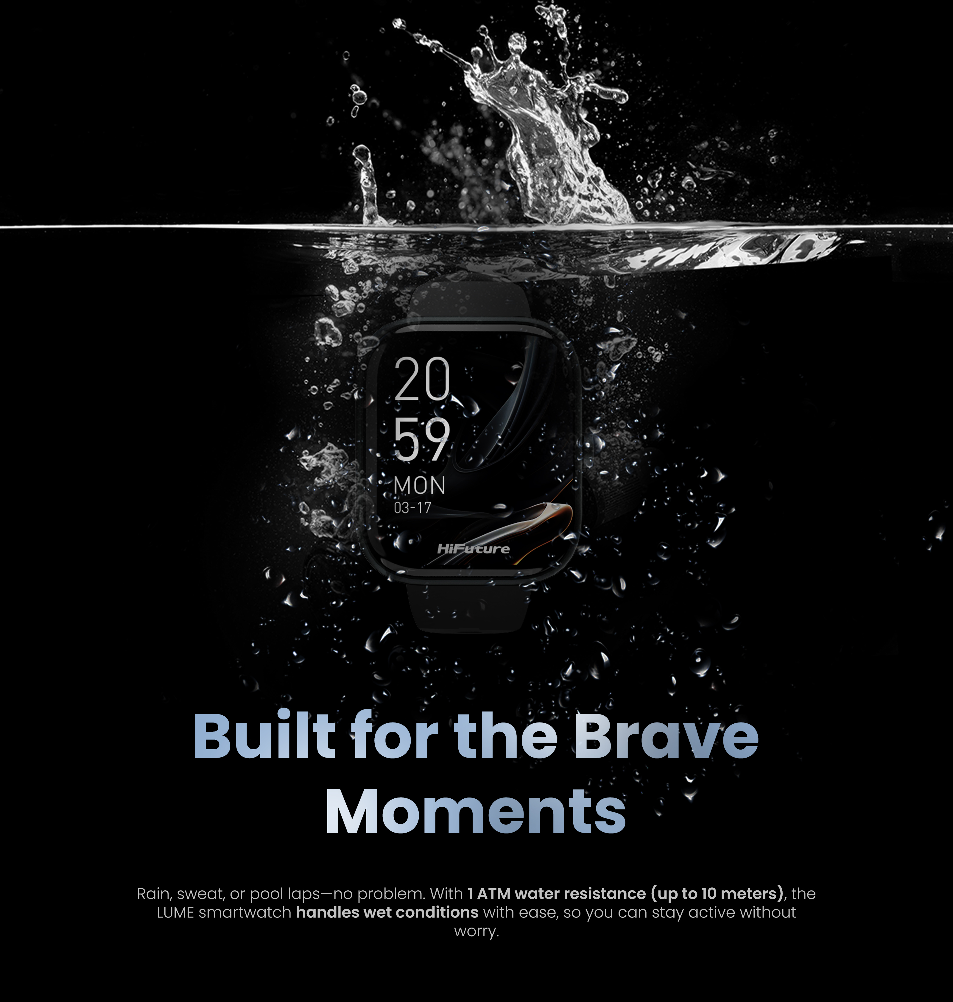 Ploaie, transpirație sau ture în piscină — nicio problemă. Cu rezistență la apă 1 ATM (până la 10 metri), ceasul LUME face față cu ușurință condițiilor umede, astfel încât să rămâi activ fără griji.
