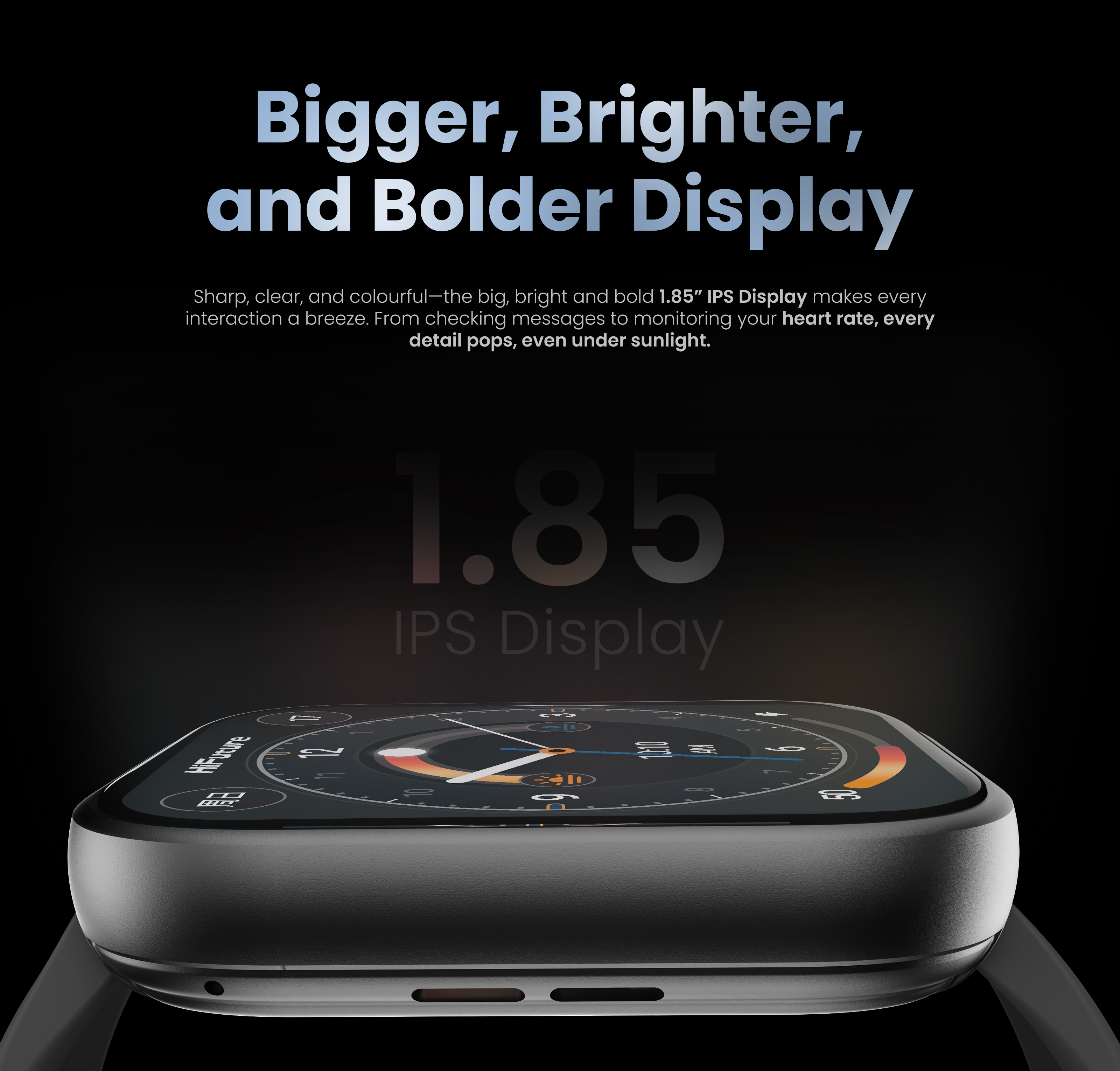 Clar, precis și plin de culoare — ecranul IPS de 1,85” mare, luminos și expresiv face fiecare interacțiune extrem de ușoară. De la verificarea mesajelor până la monitorizarea ritmului cardiac, fiecare detaliu este vizibil clar, chiar și în lumina puternică a soarelui.