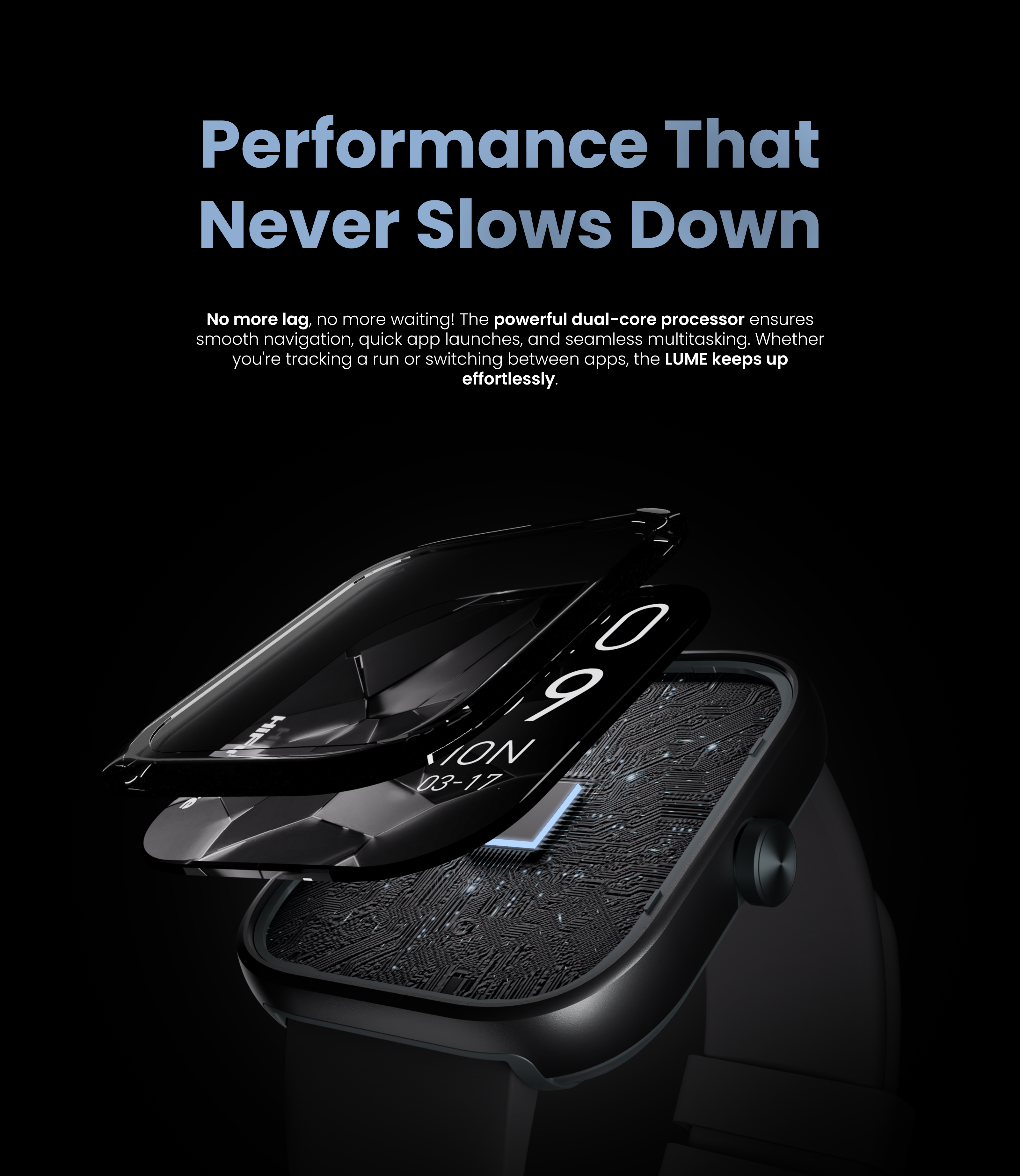 Fără întârzieri, fără așteptare! Procesorul puternic dual-core asigură navigare fluentă, lansare rapidă a aplicațiilor și multitasking fără întreruperi. Fie că îți urmărești alergarea sau schimbi aplicațiile, LUME ține pasul fără efort.