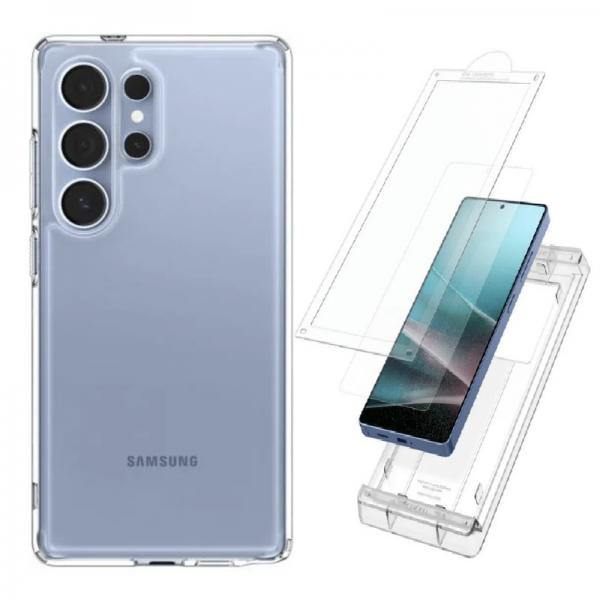 [Combo] Samsung Galaxy S25 Ultra, Carcasa Spigen Ultra Hybrid + Folie protectie hibrid cu sistem de montare Spigen Elite Shield EZ FIT HD