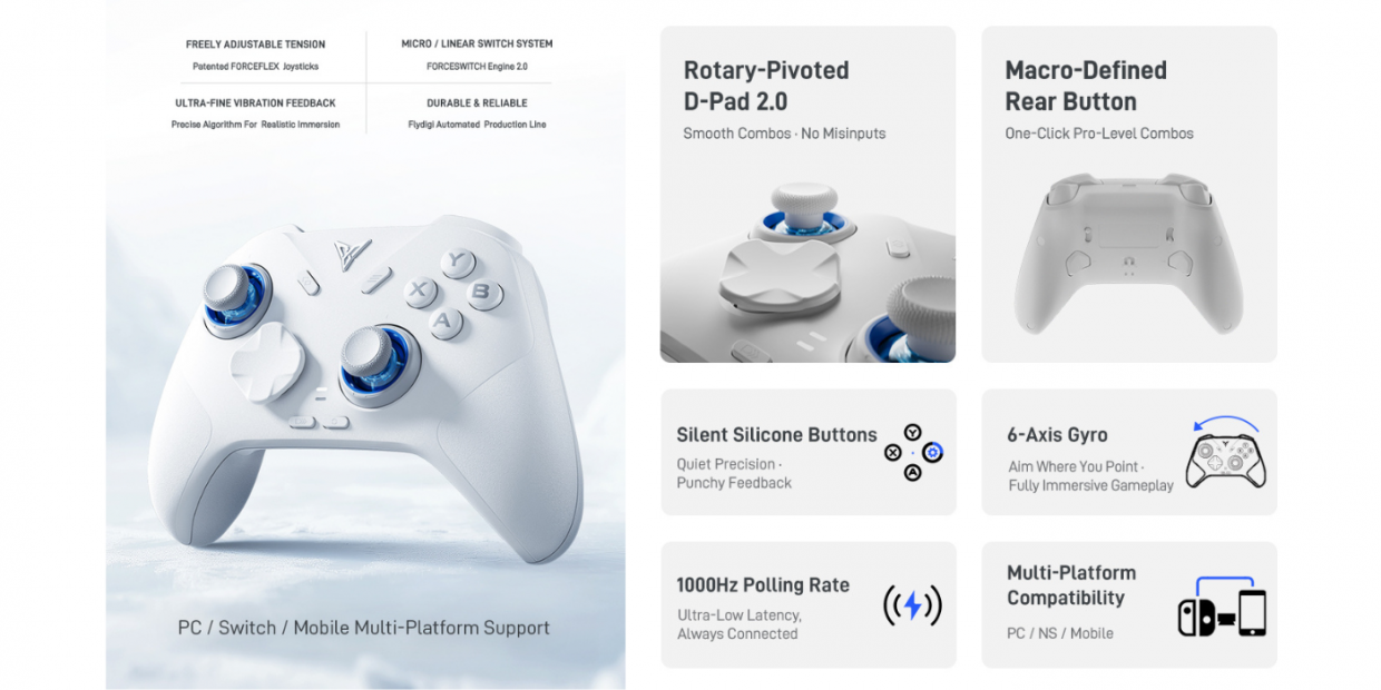 Flydigi DIREWOLF 4 este un controller excepțional care oferă jucătorilor control total asupra gameplay-ului, datorită utilizării tehnologiilor inovatoare și preciziei remarcabile. Echipat cu joysticks-uri cu rezistență ajustabilă și trigger-e de vibrație precise, controllerul oferă o reacție incomparabilă și confort, chiar și în cele mai intense momente ale jocului.