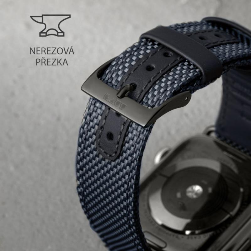 Închiderea clasică cu cataramă permite ajustarea pentru încheieturi cu circumferința între 160 și 200 mm. Catarama și adaptoarele, perfect modelate pentru Apple Watch de 42 sau 44 mm, sunt realizate din oțel inoxidabil, accentuând designul elegant și atemporal.