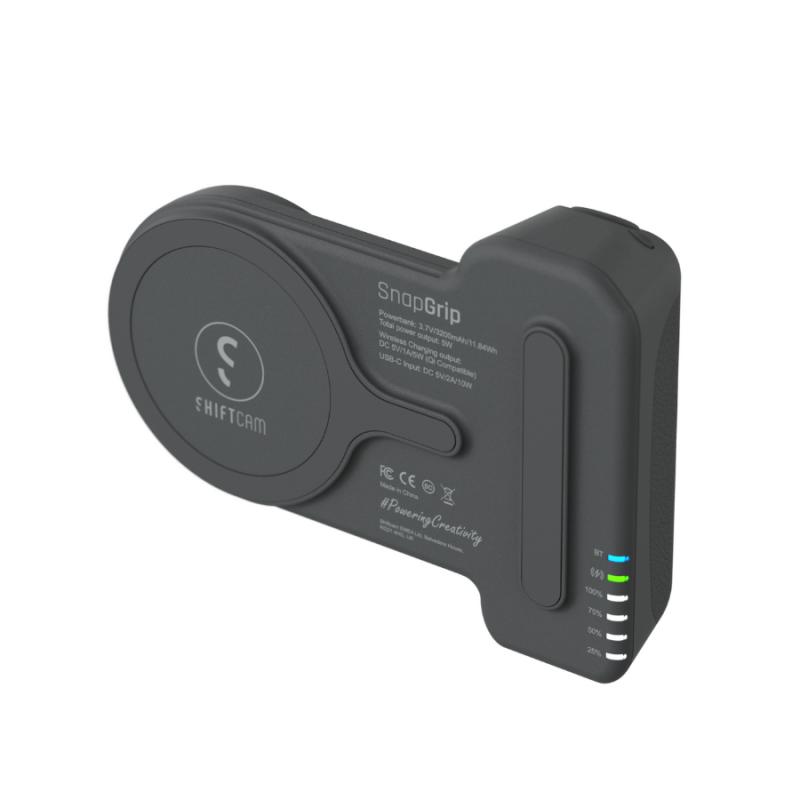 Deoarece sistemul MagSafe a fost introdus inițial ca soluție de încărcare, are sens că bateria de 3.200 mAh din SnapGrip servește și ca încărcător wireless și stație de andocare. Acest lucru este util dacă filmezi videoclipuri care consumă multă energie sau decizi să folosești gripul ca suport în timpul apelurilor FaceTime. Cu această funcție practică, te poți concentra pe creațiile tale oricând dorești! Gripul în sine poate fi încărcat clasic prin cablu USB-C, portul de încărcare fiind situat în partea de jos a gripului. Pe laterale, vei găsi șase LED-uri mici care indică nivelul bateriei rămase.