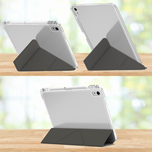 Carcasa este echipată cu un capac Y pliabil și detașabil, care îți permite să poziționezi iPad-ul în trei poziții convenabile – ideal pentru scriere, vizionarea filmelor sau videoconferințe.