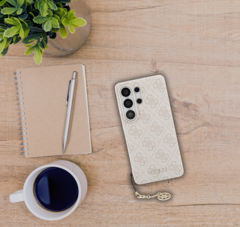 Elegantă, husa Guess din colecția 4G Charms se remarcă prin stilul său, cu un model 4G recognoscibil, marcat cu un logo GUESS auriu.